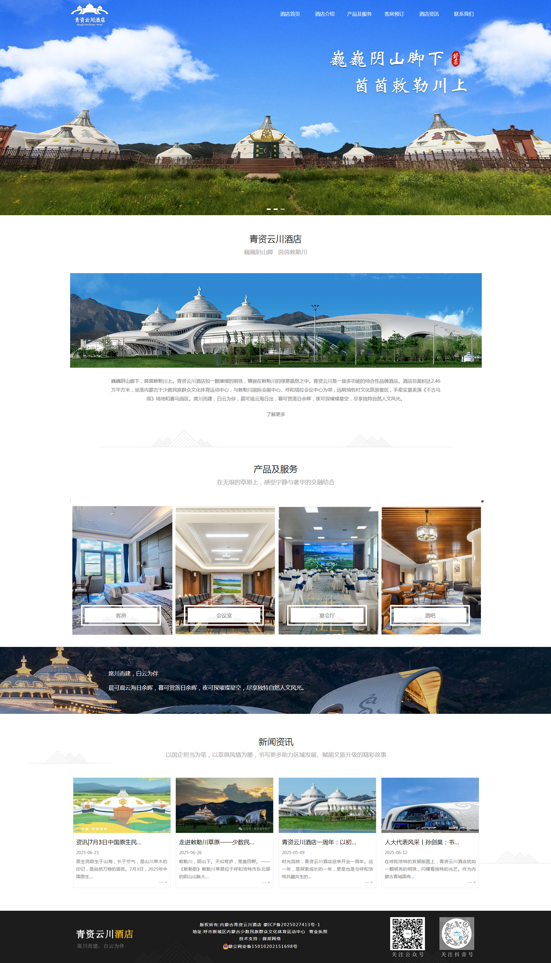 巍巍陰山腳下,茵茵敕勒川上。青資云川酒店如一顆璀璨的明珠,鑲嵌在敕勒川的綠意盎然之中。青資云川是一座多功能的綜合性品牌酒店。酒店總面積達2.46萬平方米,坐落內蒙古于少數民族群眾文化體育運動中心,與敕勒川國際會展中心、呼和塔拉會議中心為鄰,遠眺惱包村文化旅游景區,手牽實景表演《千古馬頌》場地和賽馬園區。席川而建,白云為伴,晨可觀云海日出,暮可賞落日余暉,夜可探璀璨星空,盡享獨特自然人文風光。