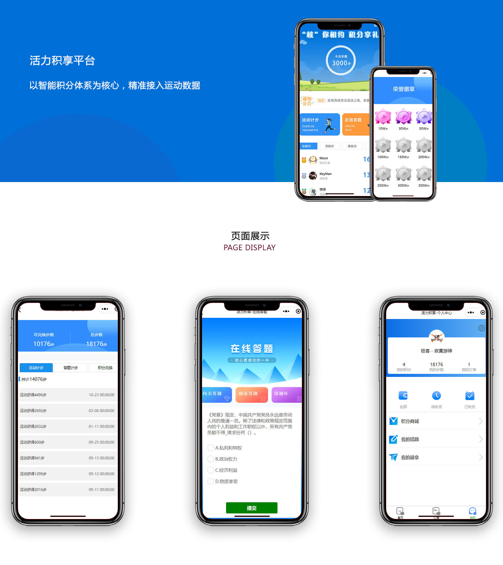 XX集團活力積享平臺依托微信小程序即用即走,以智能積分體系為核心,精準接入運動數據,實時統計并轉換積分,動態生成多維榜單,達標贈專屬徽章,激發全員參與;創新“闖關+抽題”雙模式答題,靈活題庫與實時反饋,自動歸檔錯題,實現趣味學習與積分雙贏;積分可兌多樣化禮品,后臺自定義規則與商品庫,全流程在線審核透明高效;搭配智能管理后臺,多端登錄一鍵管控用戶、題庫、商城及數據,分類統計直觀清晰,年度自動重置保障公平,助力企業數字化管理升級!
